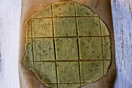 4. Раскатайте тесто в пласт, сверните пополам, раскатайте еще раз, повторите так несколько раз. Раскатайте тесто на бумаге для выпечки, толщина 2 — 3 мм., разрежьте на квадраты, наколите вилкой. Выпекайте в разогретой духовке при 180С около 15 минут. как приготовить галеты с травами, шаг 4, как приготовить фото