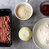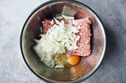 | 2. Смешайте фарш и лук. Добавьте яйцо. Посолите, добавьте чёрный перец по вкусу. Перемешайте. | ![]() |