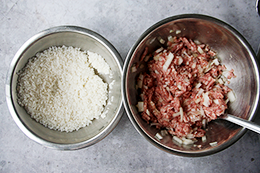| 3. Слейте воду из риса. Смешайте фарш с рисом. Можно также добавить 2 ст. л. муки. | ![]() |