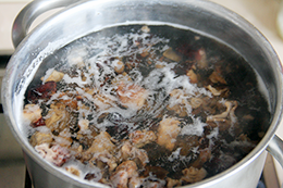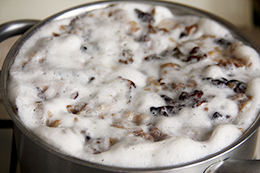 | 1. Грибы промойте, нарежьте. Положите в кастрюлю с водой, добавьте ложку соды. Варите 15 минут после закипания, пену снимайте. | ![]() |