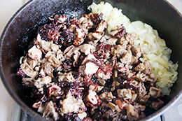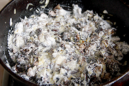 | 3. Добавьте к луку сморчки. Готовьте на небольшом огне около 10 минут. Потом добавьте измельчённый чеснок, жарьте минуту. | ![]() |