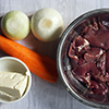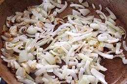 | 1. Нарежьте лук полукольцами, обжарьте на растительном масле до лёгкого золотистого цвета. Морковь натрите на крупной тёрке, добавьте обжариваться к луку. Готовьте на небольшом огне около 5 минут. | ![]() |