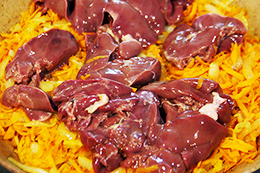 | 2. Печень промойте, положите обжариваться к овощам. Готовьте около 15 — 20 минут. В конце посолите, может быть, добавьте специи по вкусу, например, чёрный перец или горчицу. | ![]() |