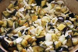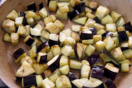 1. Баклажаны нарежьте кубиком, обжарьте на растительном масле до золотистого цвета. капуста с баклажанами, шаг 1, как приготовить фото