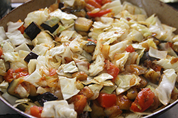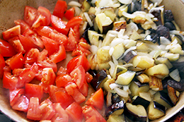 3. Отправьте в сковороду нарезанные помидоры. Если любите насыщенный помидорный вкус, можно добавить и томатную пасту. Обжарьте всё вместе еще некоторое время. Добавьте специи. как приготовить рагу из баклажана и капусты, шаг 3