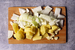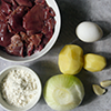 1. Печень промойте, удалите жилки, разрежьте. Картофель, лук и чеснок нарежьте произвольно. оладьи из печени, шаг 1, как приготовить фото
