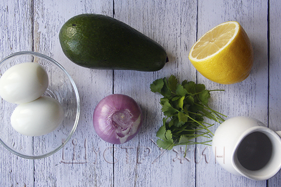 • 4. Смешайте авокадо, лук, измельчённую кинзу, яйца, заправьте оливковым маслом. Приправьте чёрным перцем по вкусу.