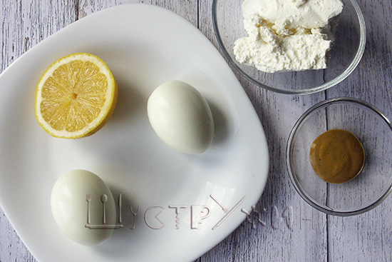 • 2. К творогу добавьте горчицу, лимонный сок, соль и перец, перемешайте.